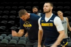 视频当中,约基奇和布劳恩赛跑,约基奇步履踉跄,布劳恩率先到达终点后比出获胜手势。