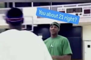 其中有一段画面为詹姆斯和好友安东尼在训练馆内练球,谈笑间安东尼质疑起詹姆斯的年龄:“你其实有21岁吧?”