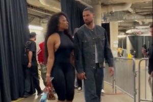 赛后,克莱手牵手携女友马冬梅离场。