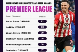 英超历史升班马前9轮战绩:
