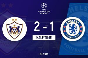 上半场伤停补时3分钟,半场结束,切尔西暂1-2卡拉巴赫。