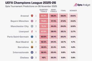 欧冠夺冠概率:阿森纳超23%断档领跑,拜仁曼城红军巴黎皇马2-6位